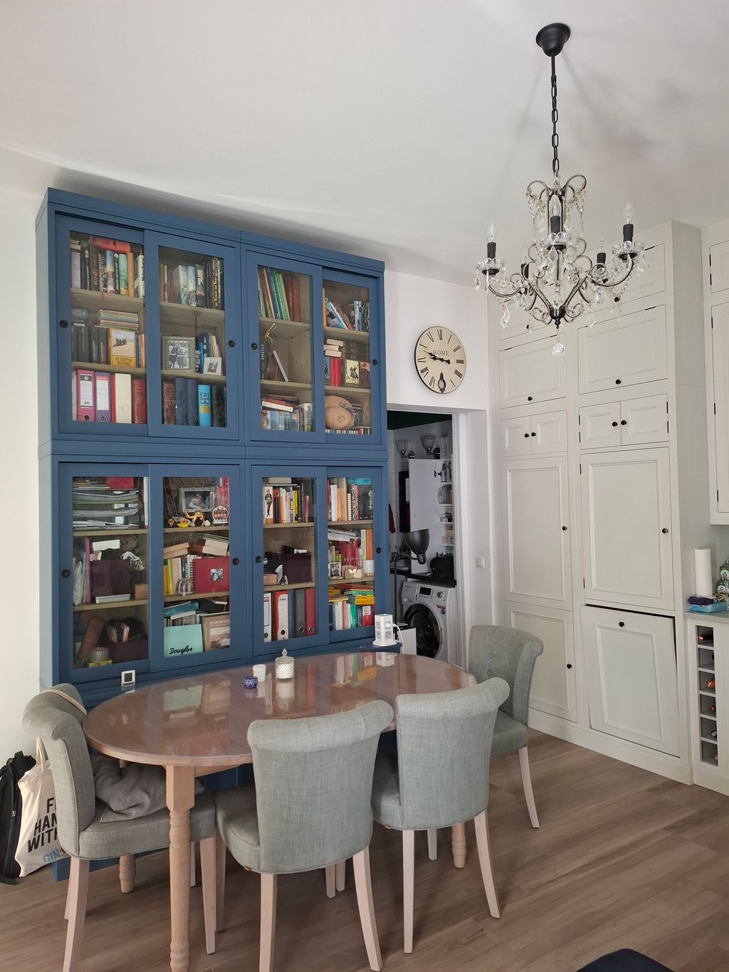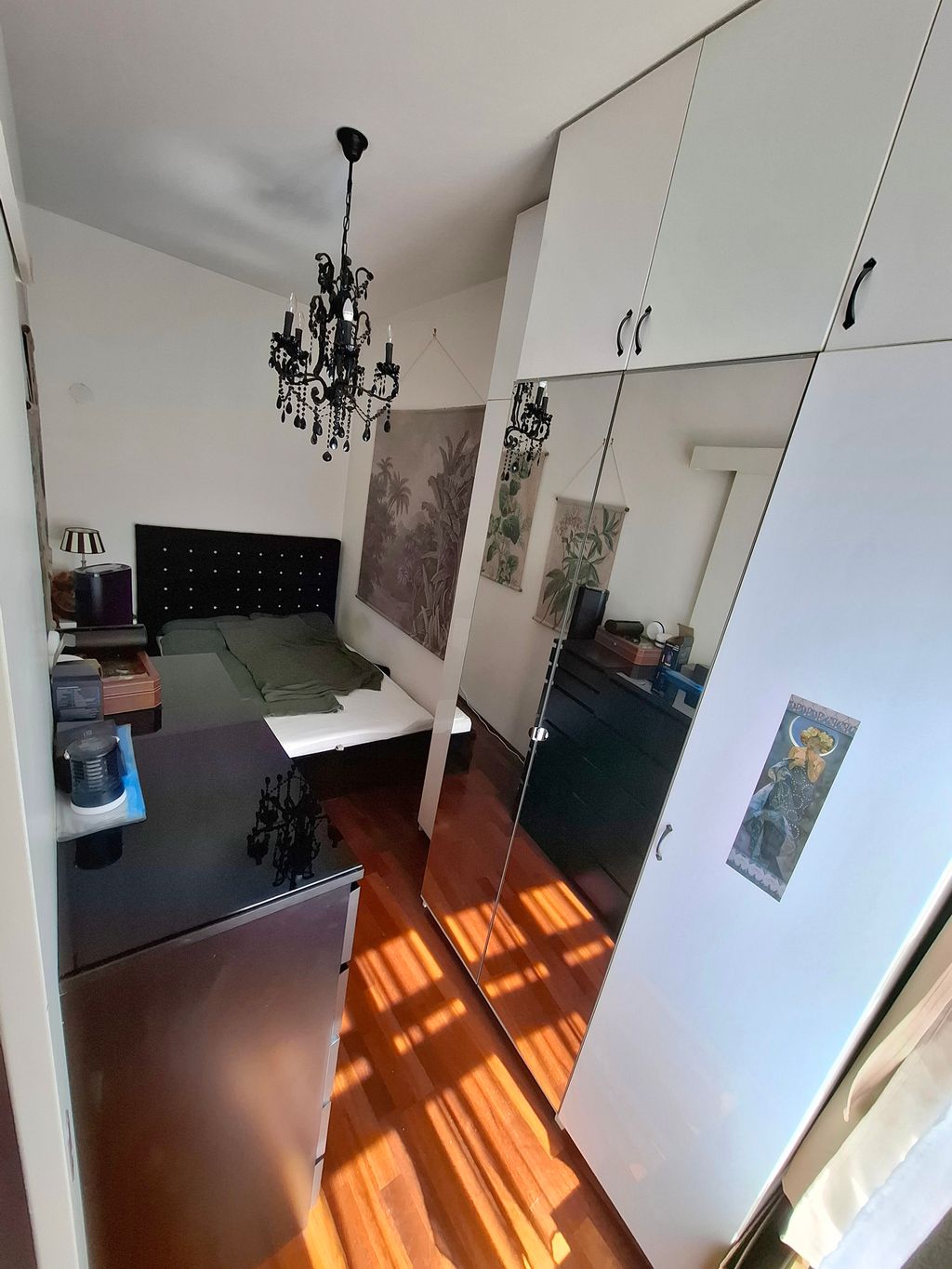· Parkettboden im Schlafzimmer, Fliesen in der Wohnküche (Feinsteinzeug in Parkettoptik)